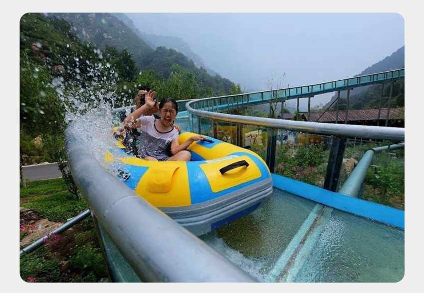 一是,依據(jù)大型生態(tài)漂流的體驗(yàn)感,設(shè)計(jì)優(yōu)化升級(jí)而來(lái)。依地勢(shì)修建漂流槽,槽內(nèi)水深約20公分,水在漂流槽中托船順流而下,速度可控,刺激與安全兼得,確保百分之三百的安全。在設(shè)計(jì)上我們可以做到游客在漂流過(guò)程中基本不濕衣物。我們暫且稱(chēng)這種形式的漂流為水滑道漂流。