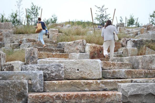 該項(xiàng)目的鋪裝道路周邊裝飾有白石,作為“眼線”,突出坡道和綠草。這些步行道中還鋪設(shè)有回收來的花崗巖石塊,它們之前是海島防浪堤,已有100多年了。(由于該項(xiàng)目,建筑師摧毀了約1.7米的防浪堤提升彈性。)