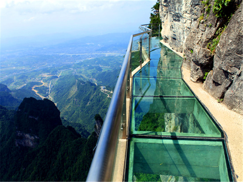 羅田天堂寨景區地處大別山主峰所在地,因其雄、奇、險、秀,獨特的山岳風光聞名于世。棧道建設歷時一年,棧道寬1.8米,全長70米,路面采用 三層鋼化夾膠防彈玻璃,每平方可承重600公斤。此處地勢險要,上下臨空,視野開闊,上看一線天瀑布、哲人峰、下俯天堂大峽谷,猴谷,吊橋河村落,位于海 潑1080米小華山一線天懸空崖壁處。